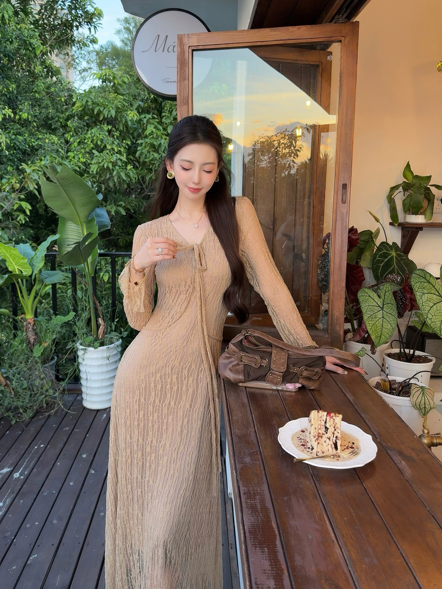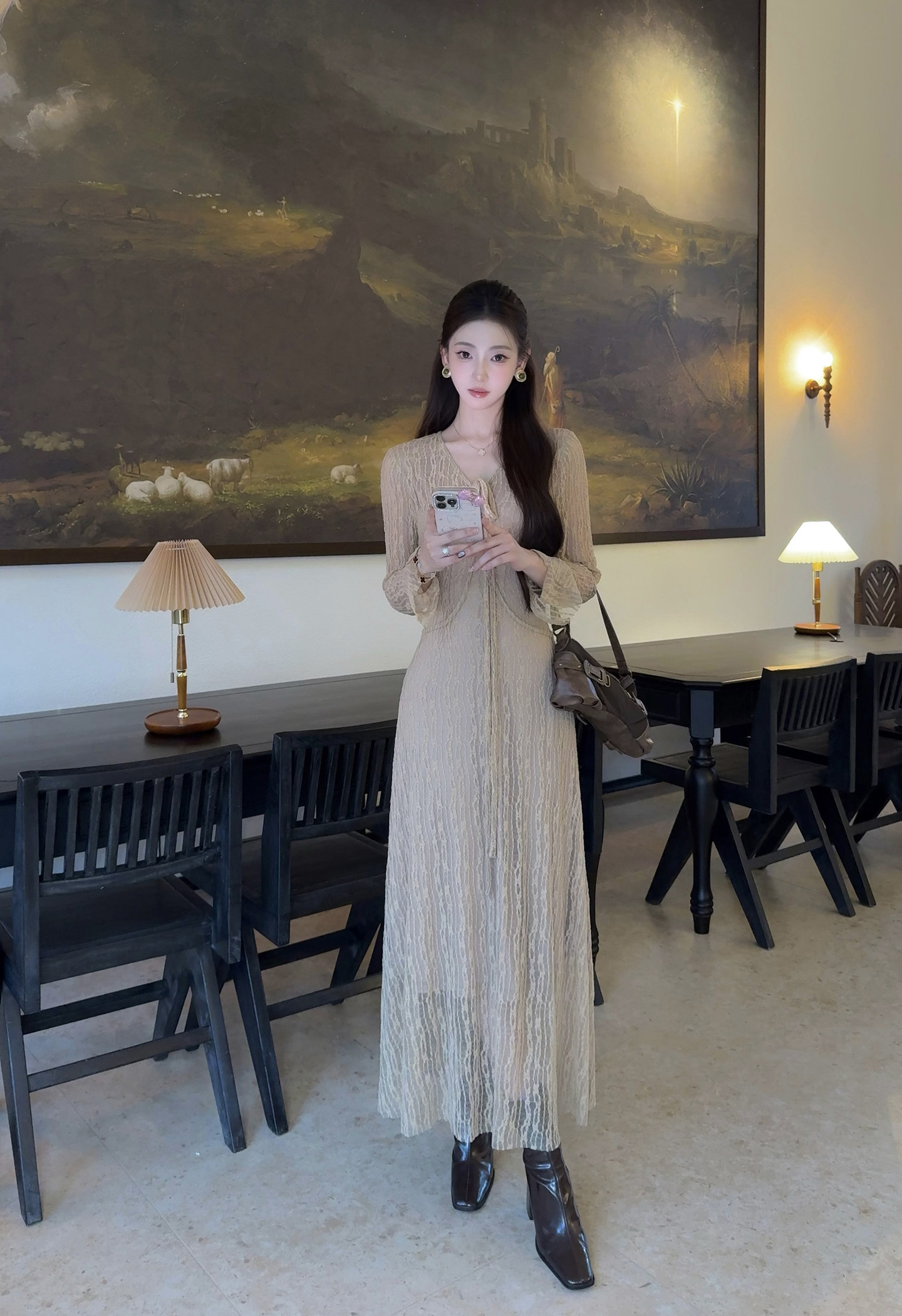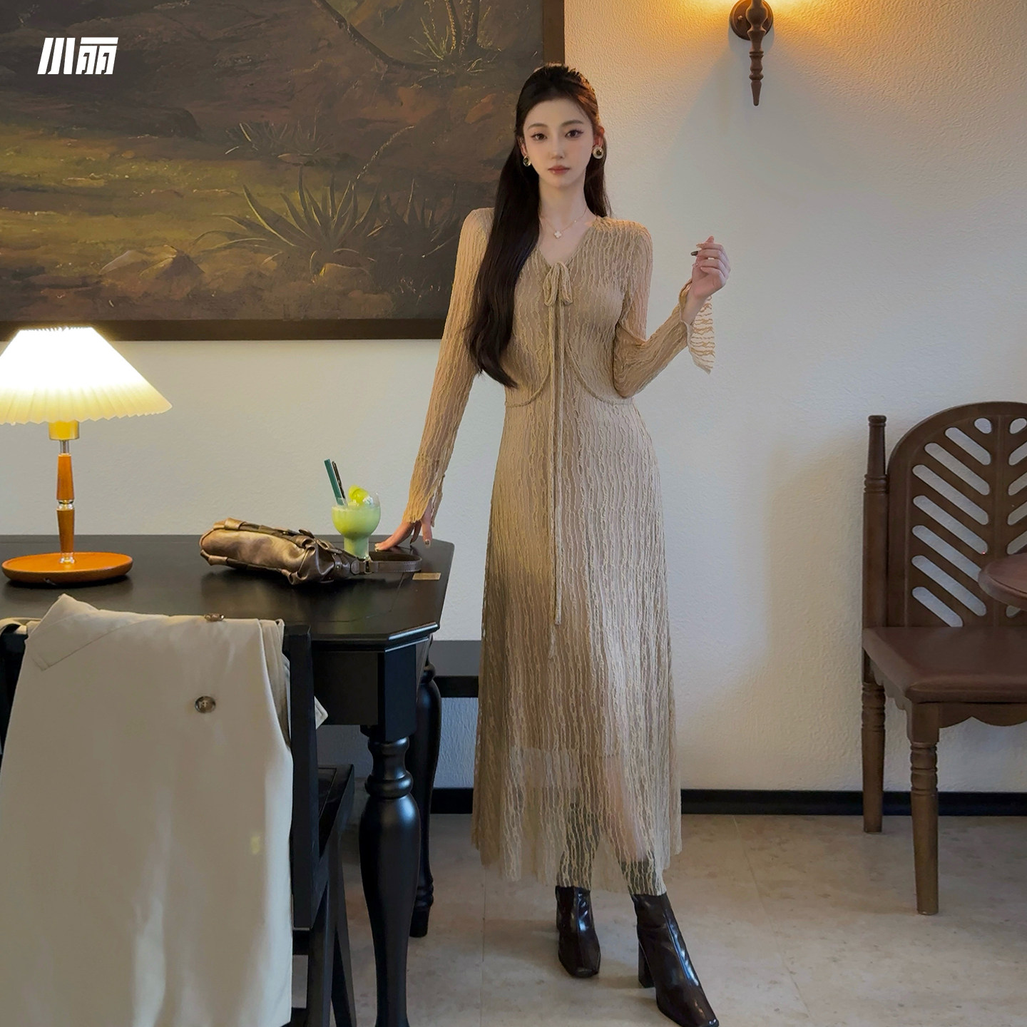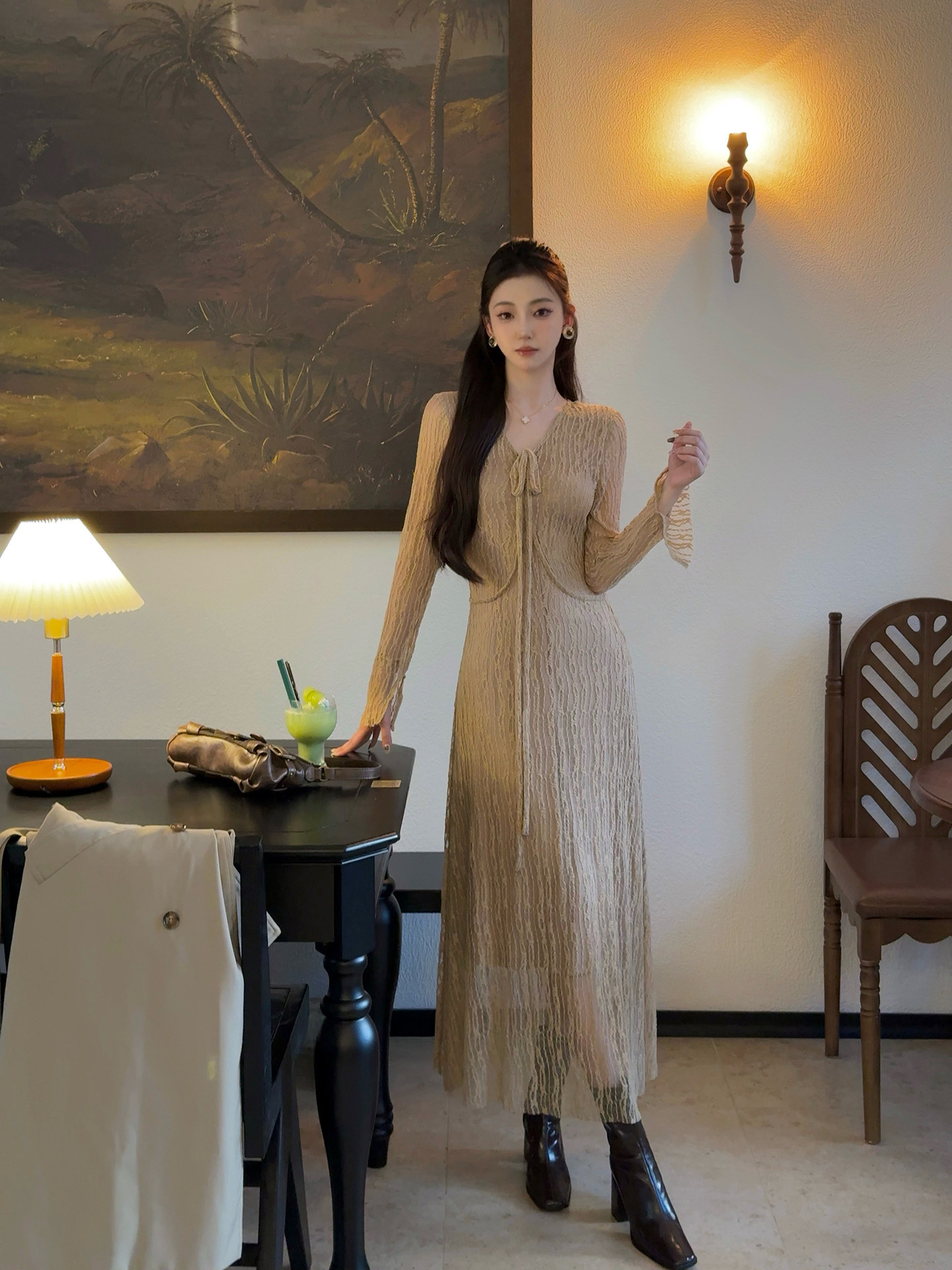 XIAOLI Beige V-Neck Flared Sleeve Knitted Long Dress