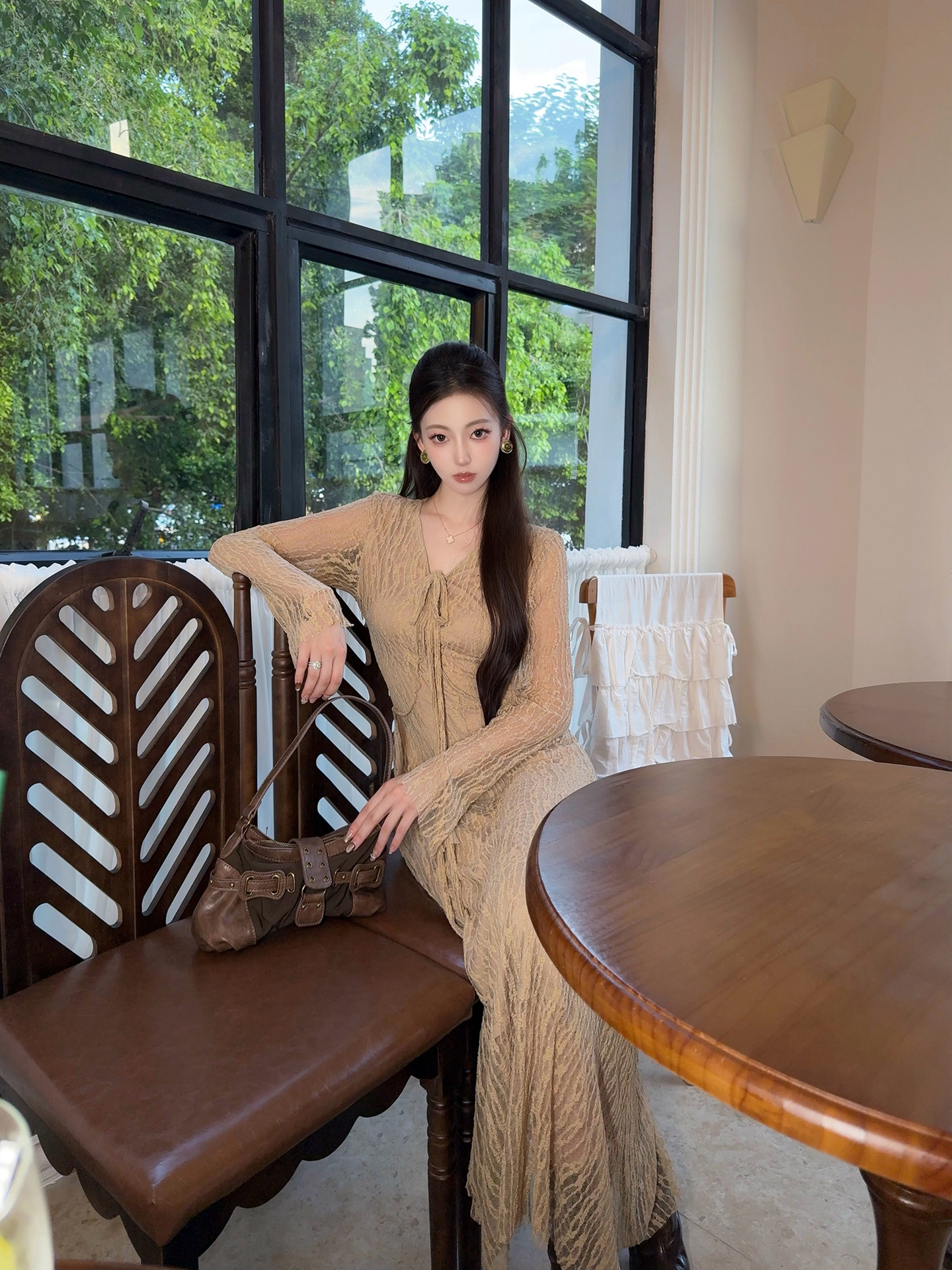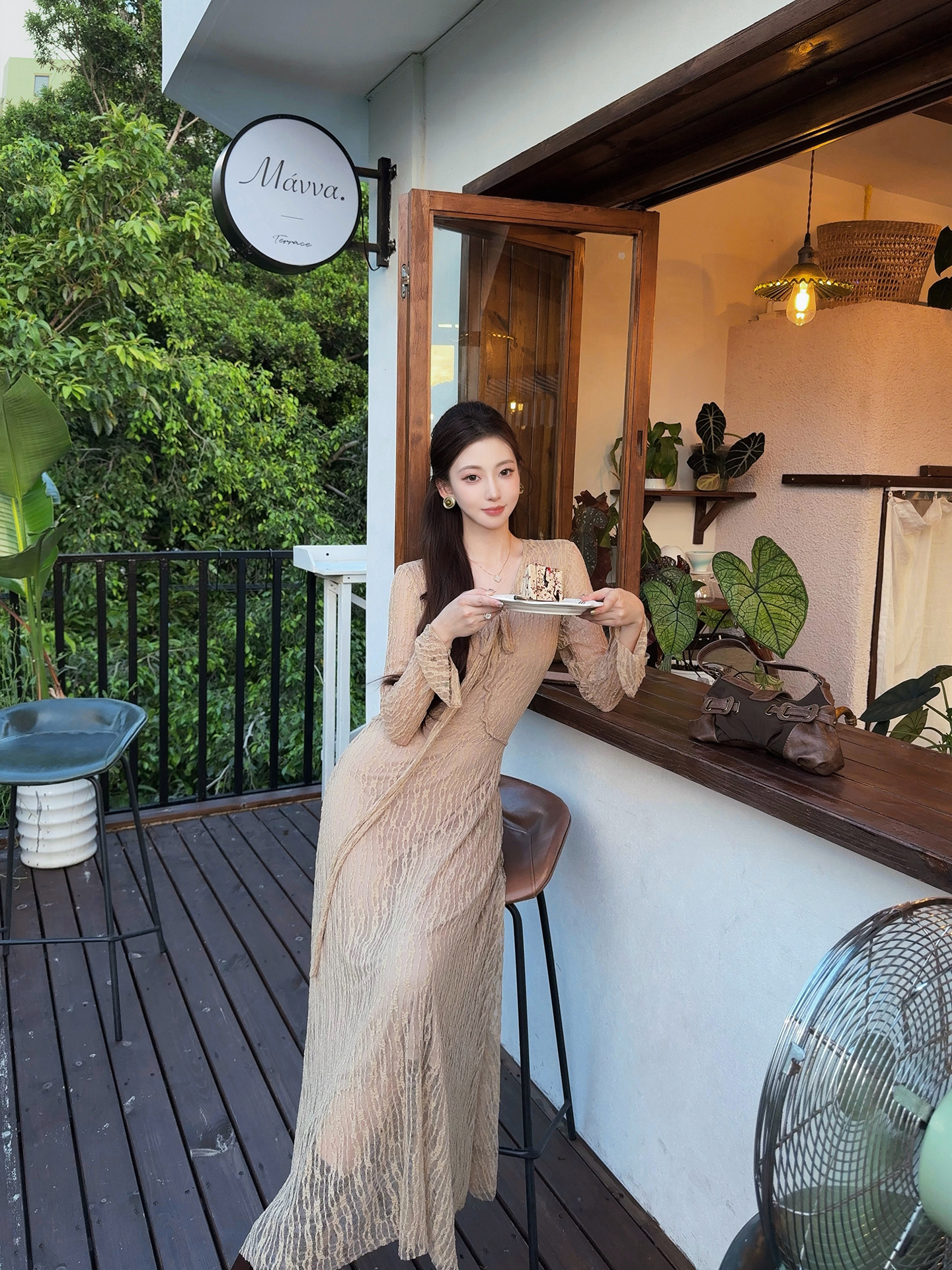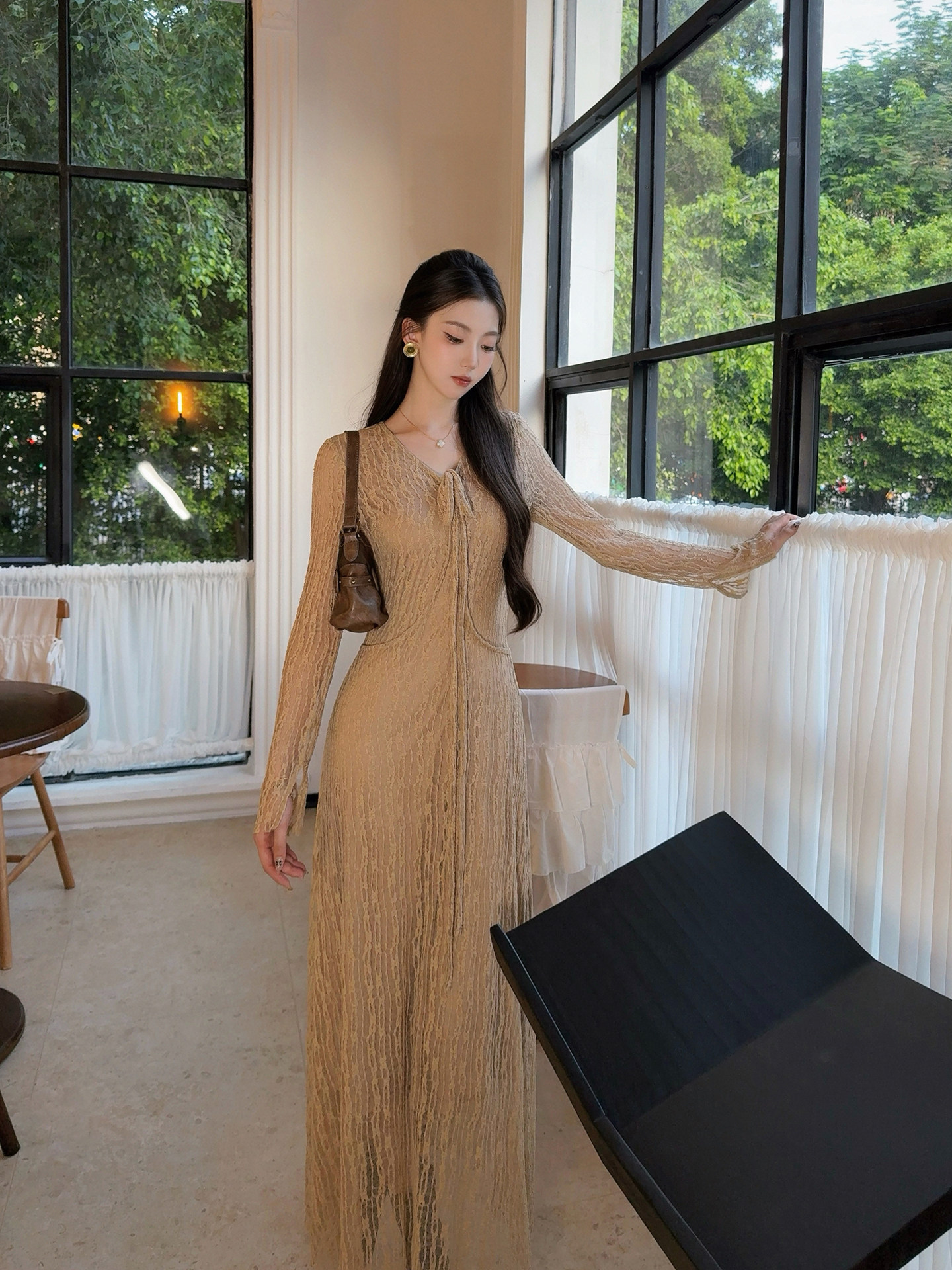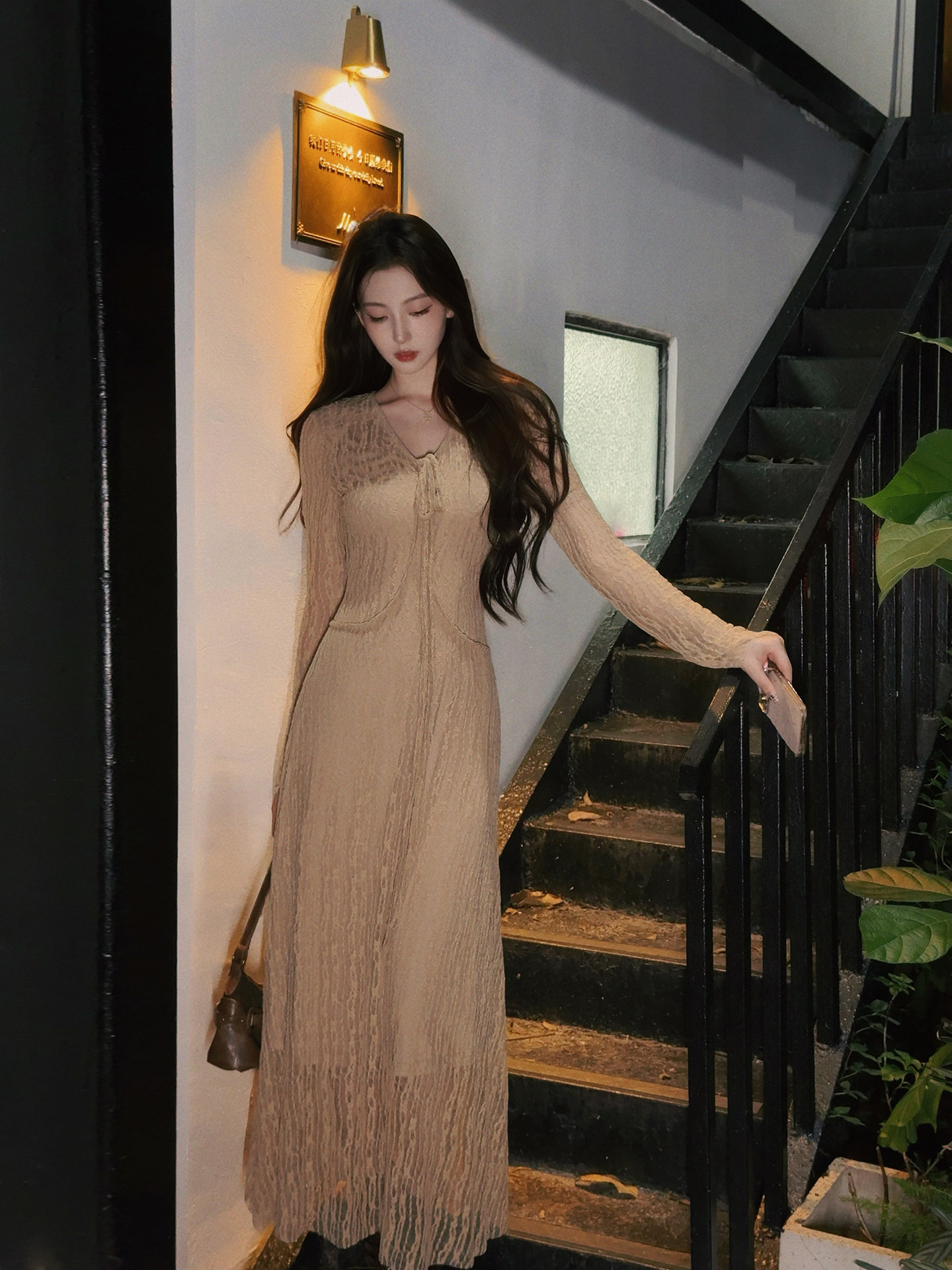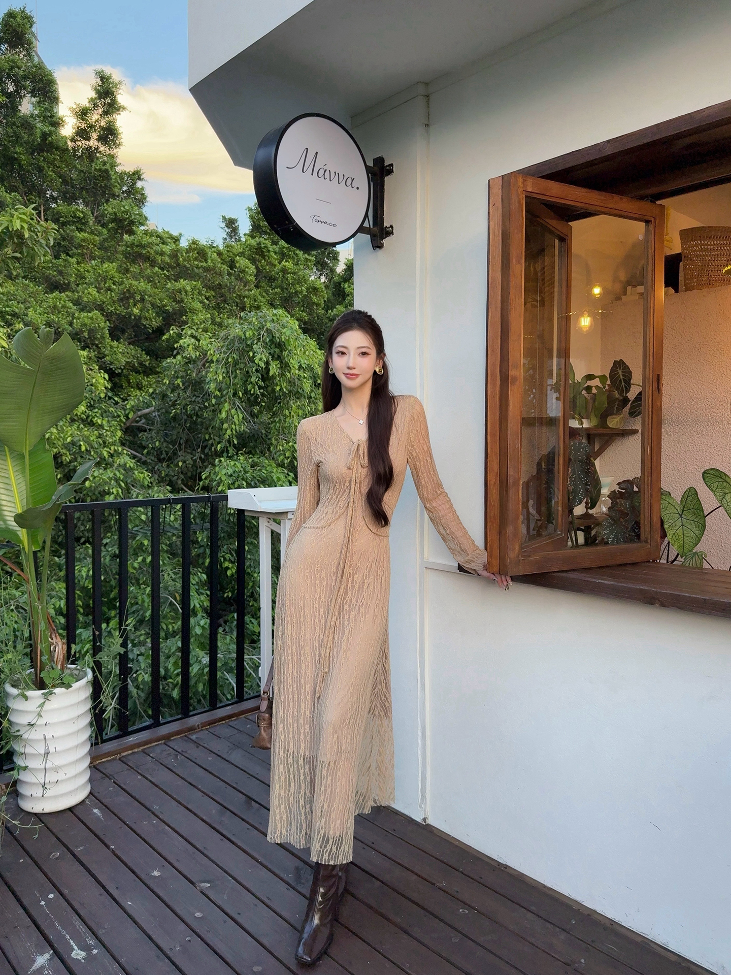 XIAOLI Beige V-Neck Flared Sleeve Knitted Long Dress