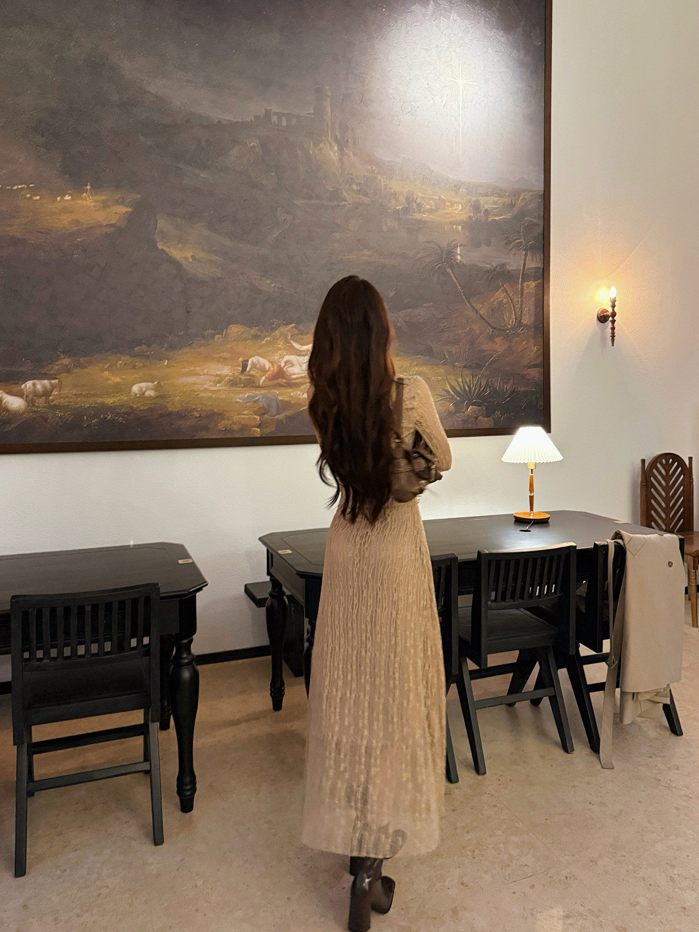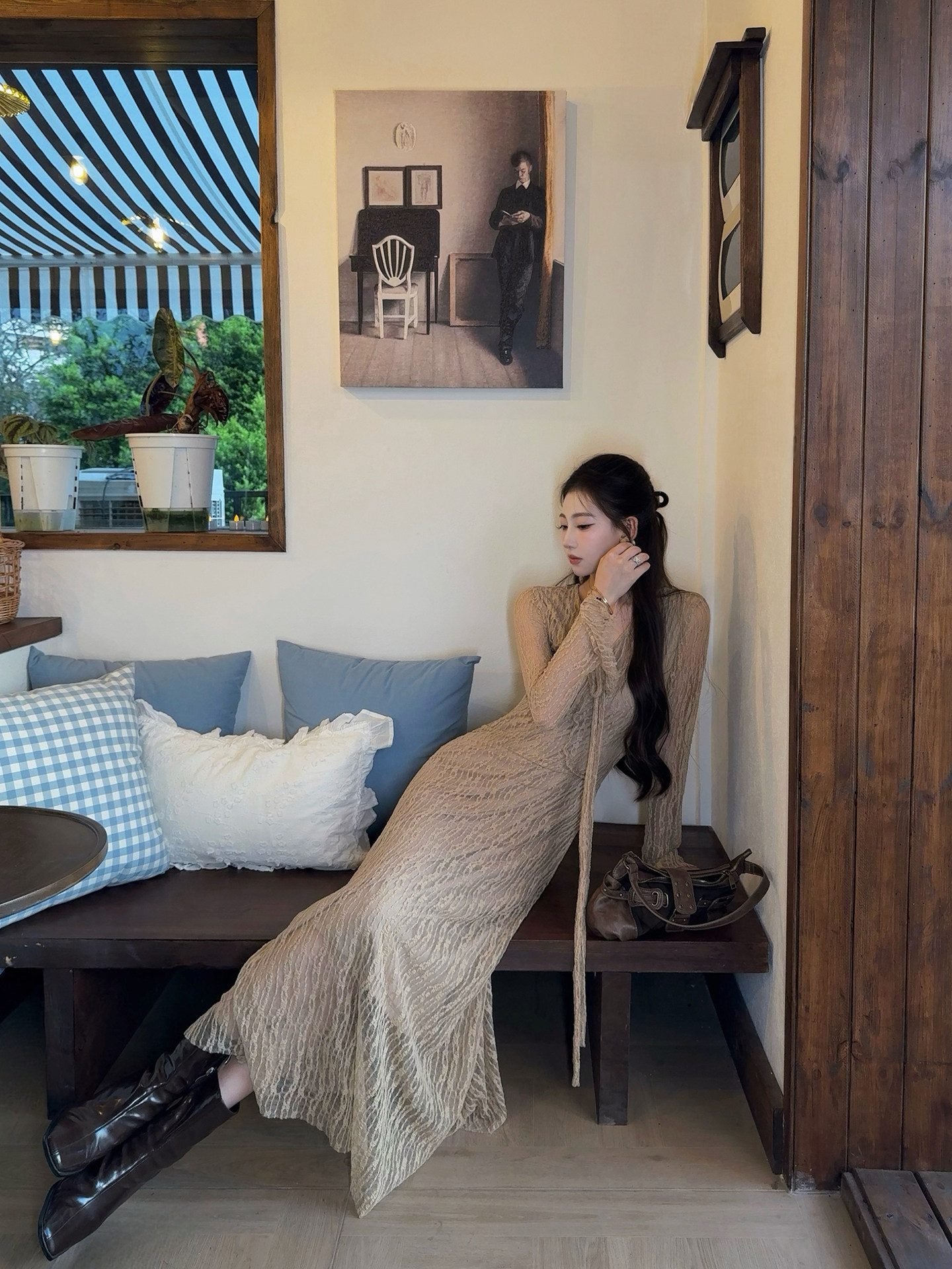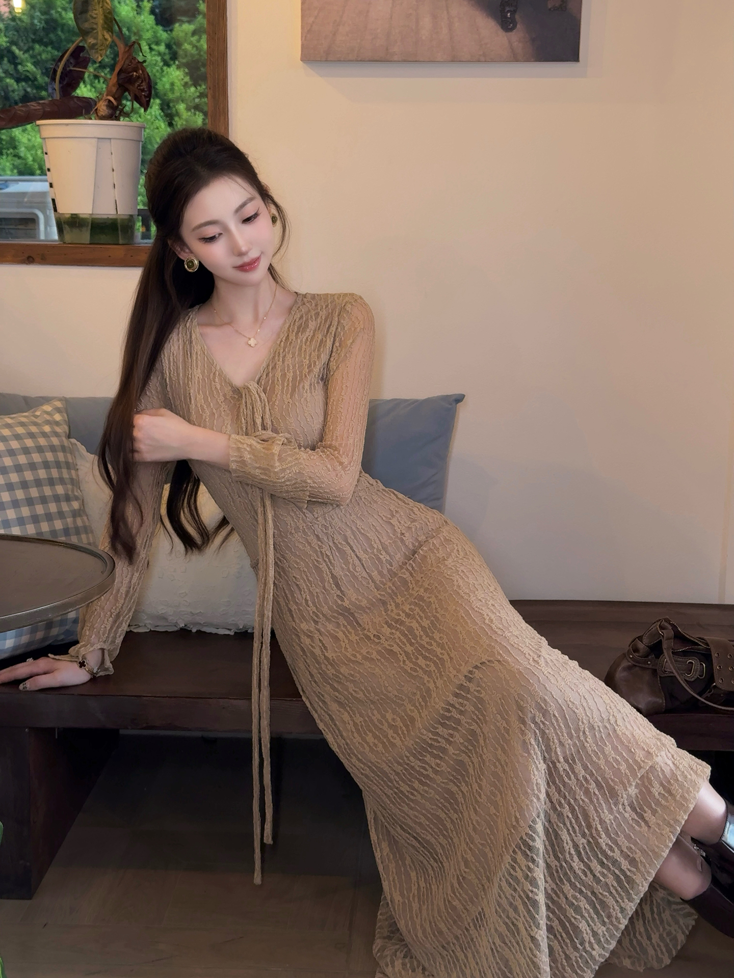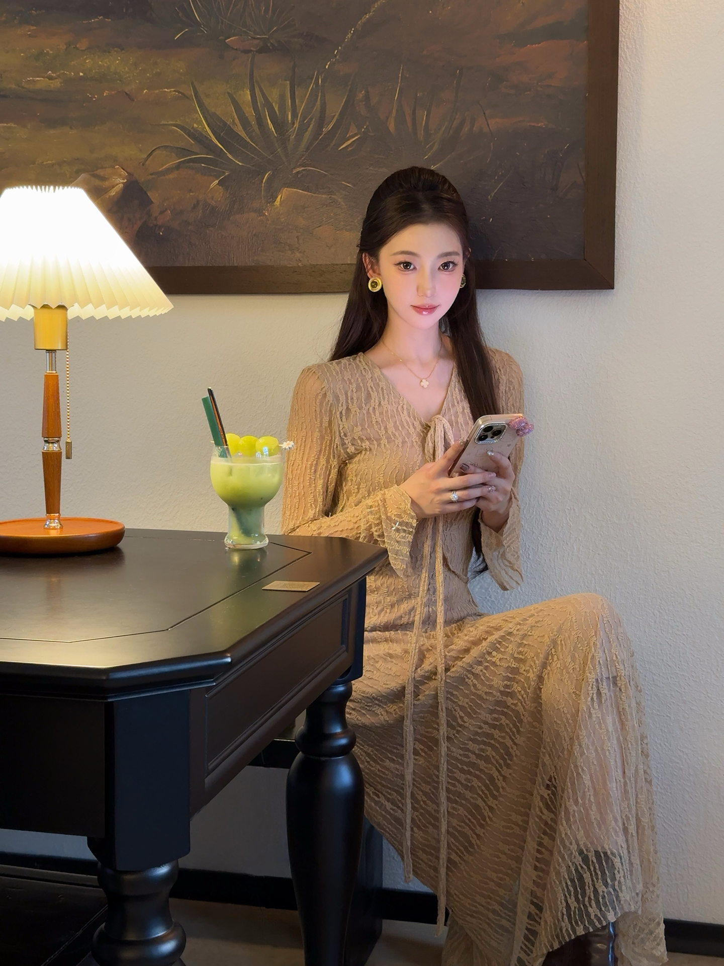 XIAOLI Beige V-Neck Flared Sleeve Knitted Long Dress