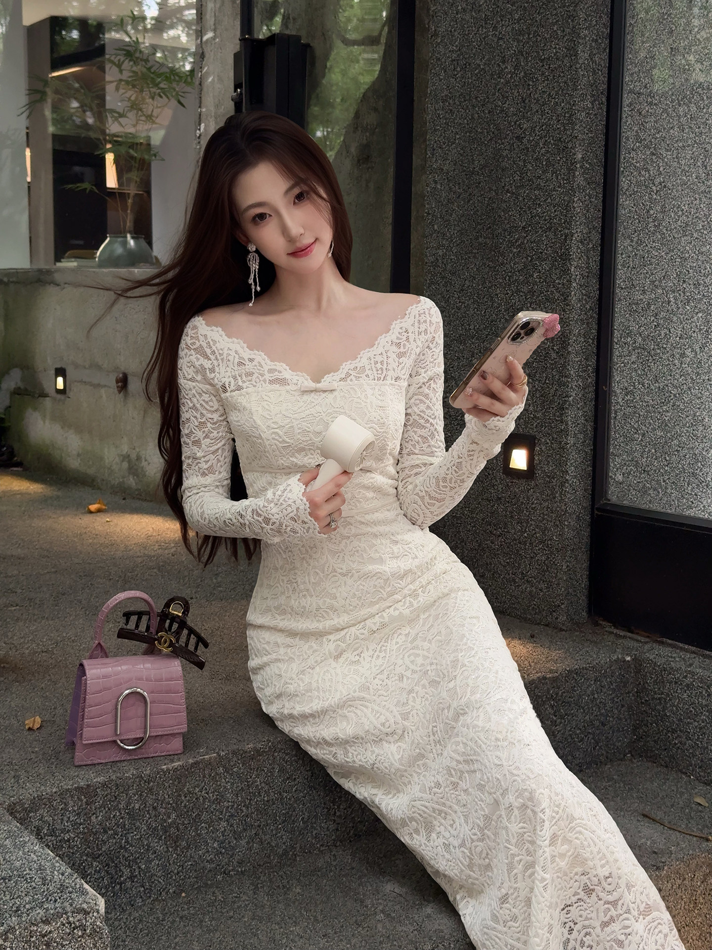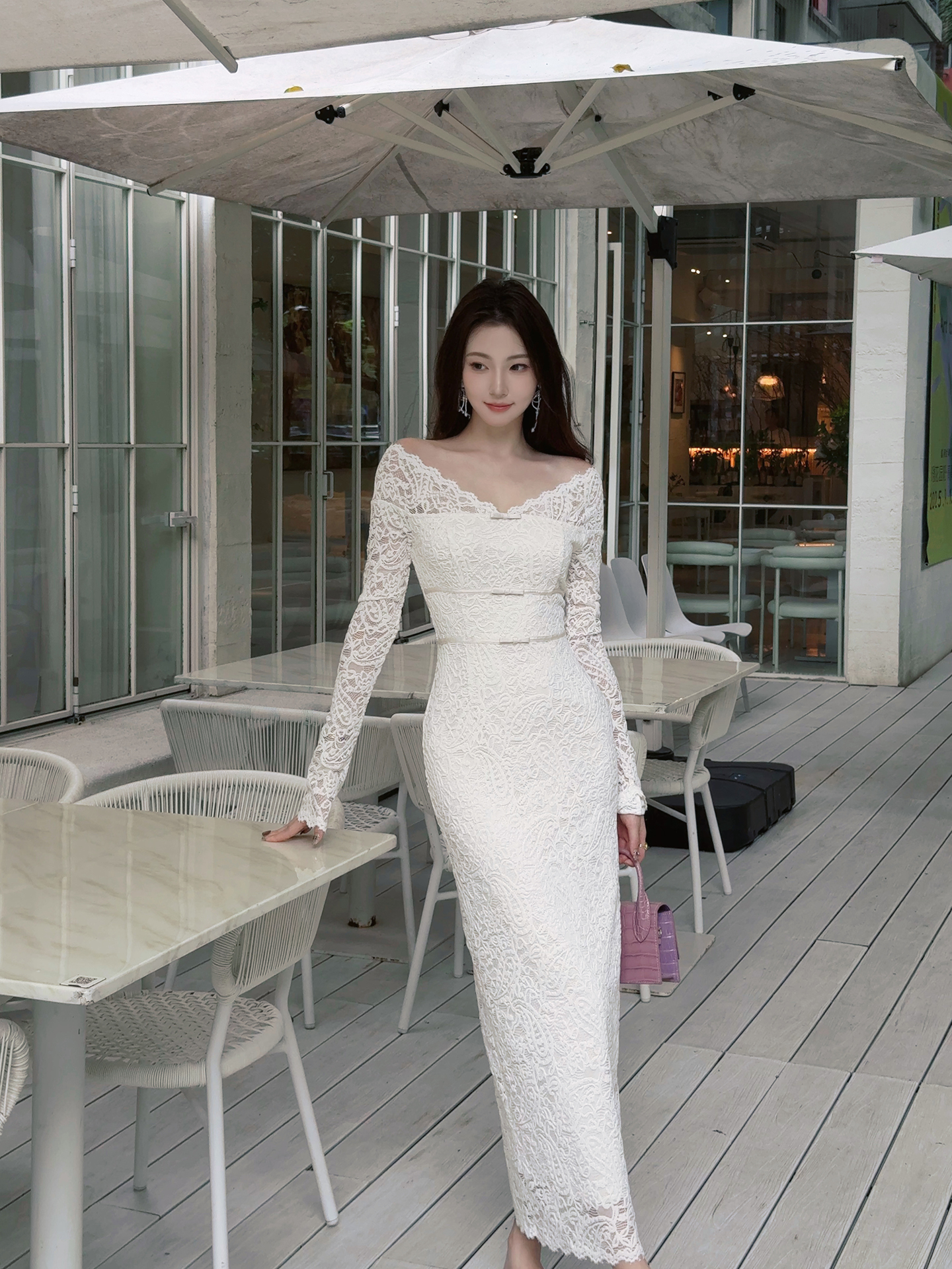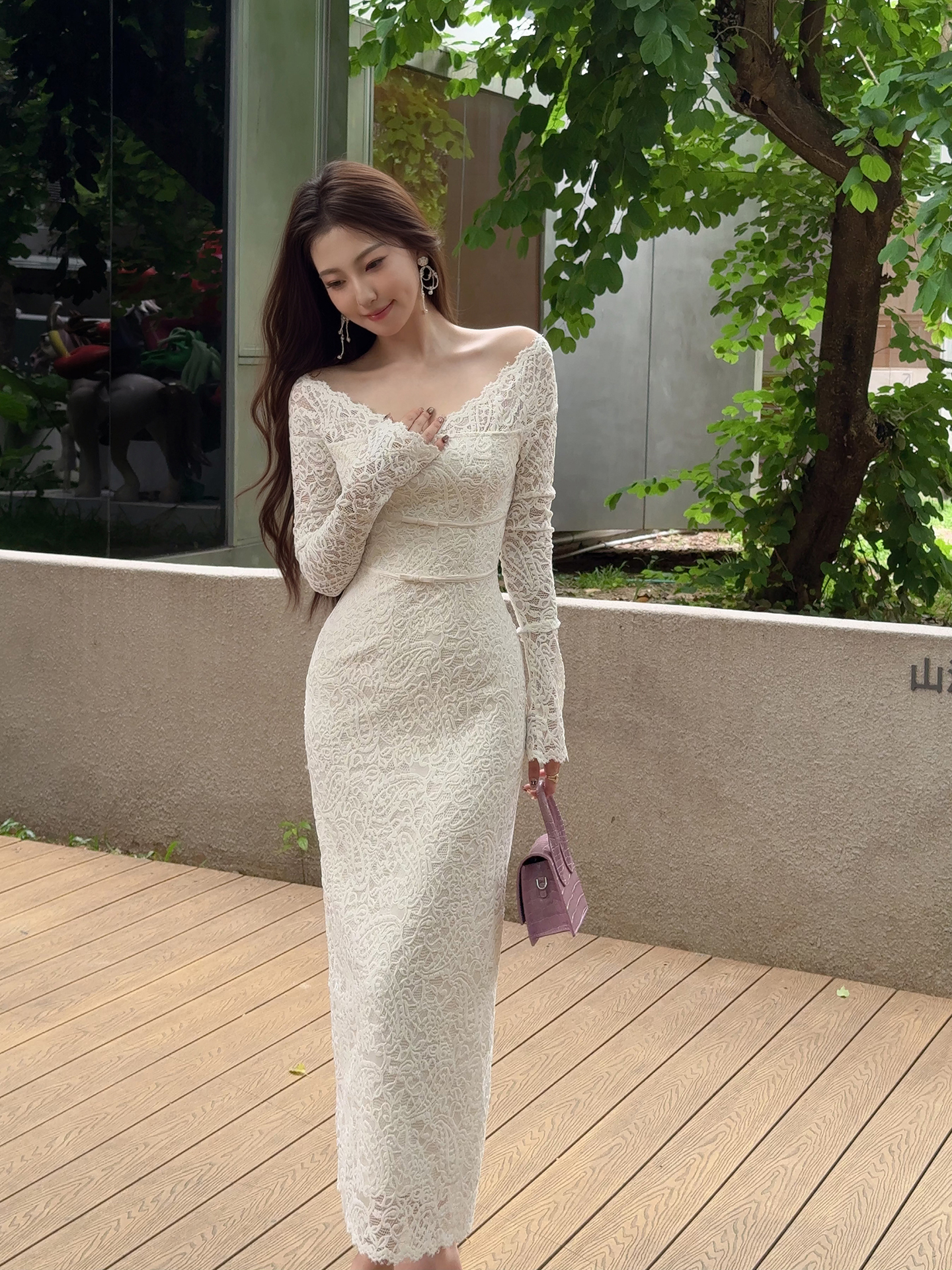 XIOALI White V-Neck Long Sleeve Bodycon Dress